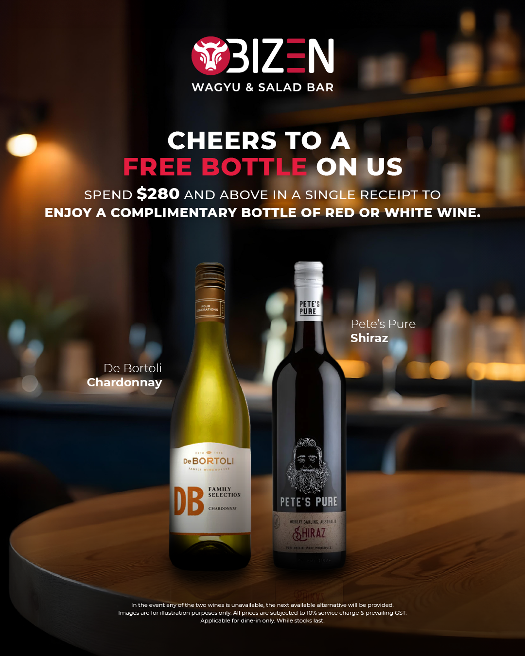 Enjoy a complimentary bottle of either red or white wine when you spend $280 and above in a single receipt. Pair with your Wagyu steak or any main course purchase and indulge in our free-flow Super Salad Buffet.